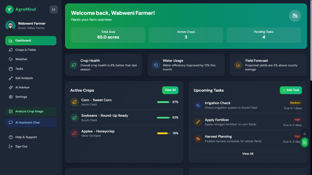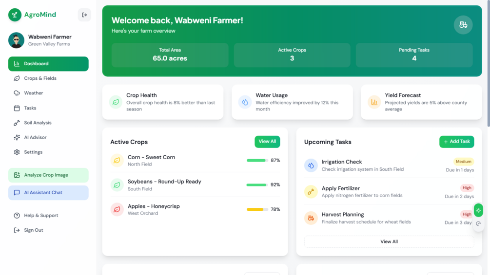 - ๐พ Dashboard with real-time metrics (soil, crop health, irrigation, etc.)