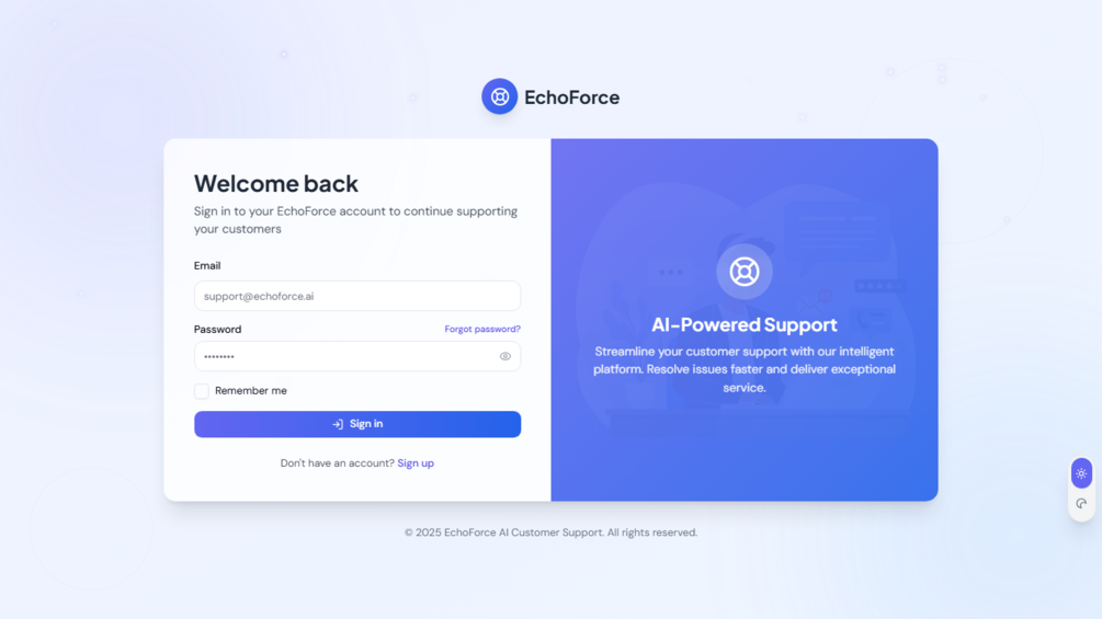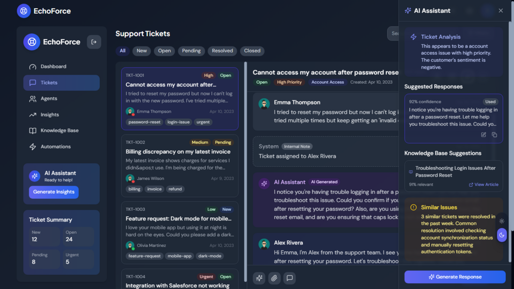 Echoforce is a modern SaaS frontend UI template designed for building next-gen AI-powered customer support platforms. Crafted with Next.js 14, Tailwind CSS 3, and Shadcn UI, this template provides a sleek, functional foundation for building tools that blend automation, real-time ticketing, and AI agent experiences into one seamless support system.