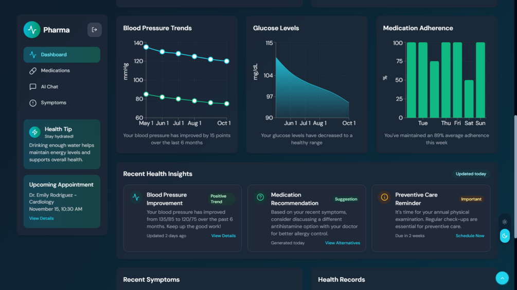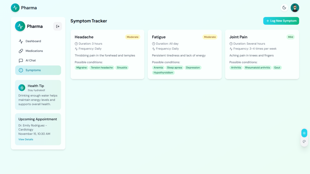 Pharma is a sleek and professional frontend UI template designed for building AI-powered digital health assistants. Built with Next.js 14, Tailwind CSS 3, and Shadcn UI, this template lays the foundation for smart personal health management tools with AI insights, medication tracking, and interactive symptom analysis.